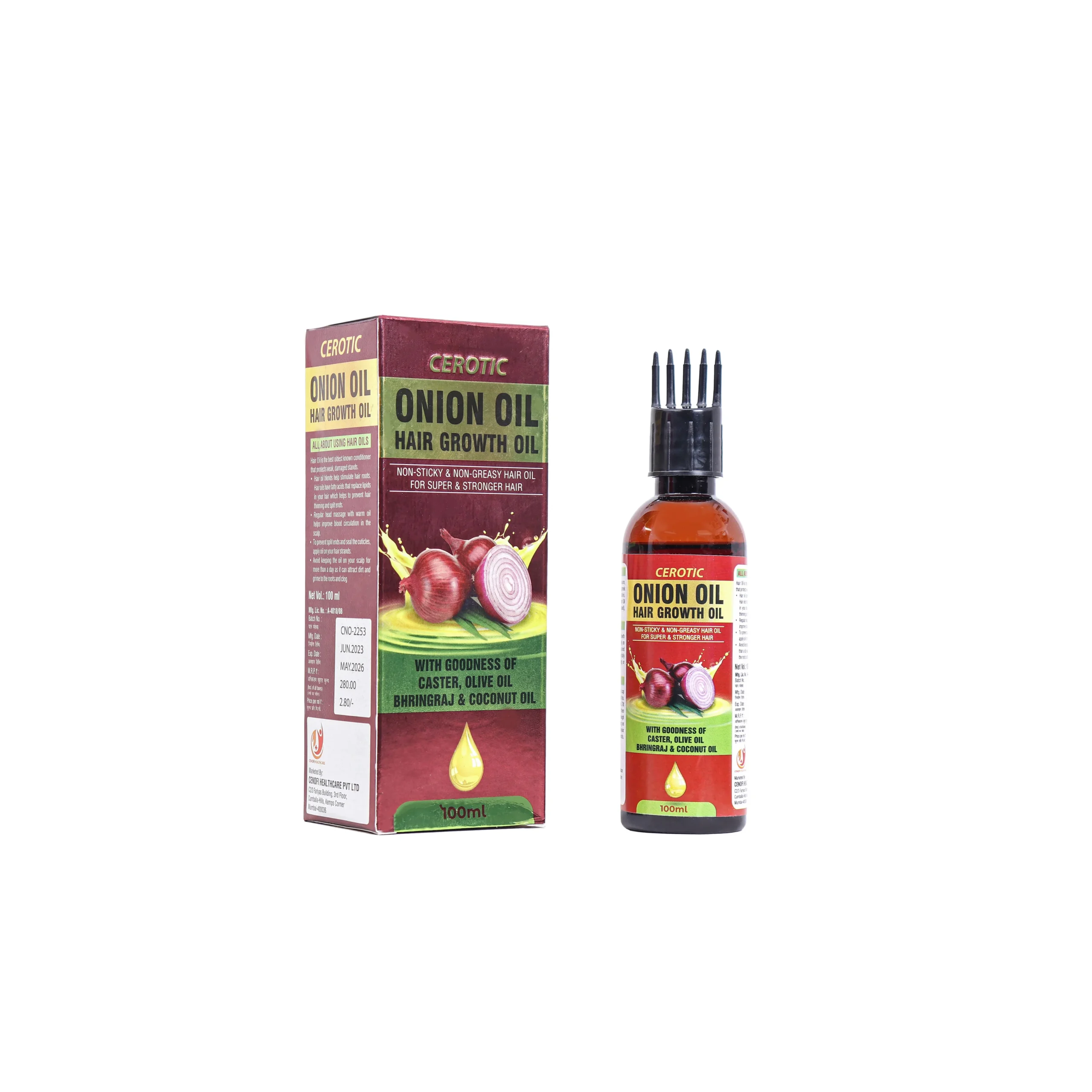 CEROTIC Onion Oil Hair Growth Oil is a non-sticky & non-greasy formula for super & stronger hair. It’s enriched with the goodness of Red Onion Oil, Castor Oil, Olive Oil (Cold Pressed), Bhringraj, Coconut Oil, and other powerful natural ingredients like Brahmi, Amla, and Fenugreek Seeds. It comes with a comb applicator for easy and precise application directly to the scalp and roots.