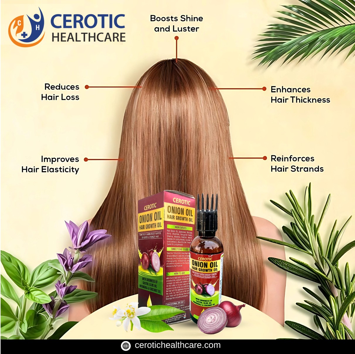 Unlock the secret to healthier, more resilient hair with CEROTIC Onion Oil Hair Growth Oil. This special, non-sticky and non-greasy formulation is designed to nourish your scalp and roots, promoting super and stronger hair.